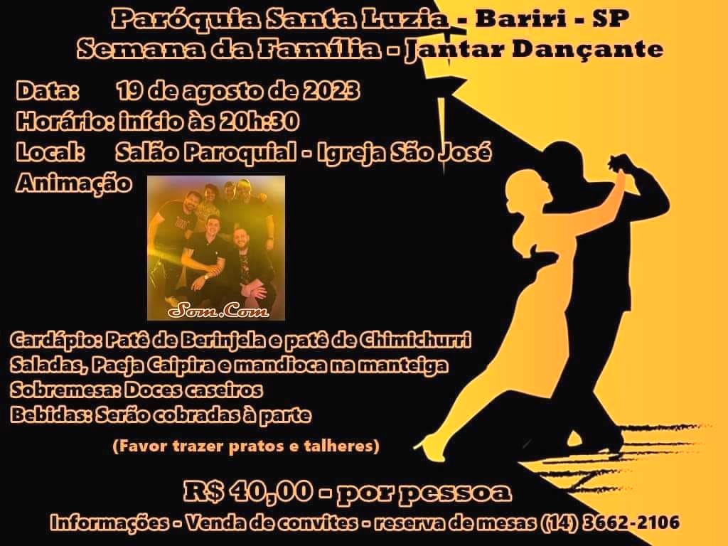 Neste sábado (19), a Paróquia de Santa Luzia encerra Semana da Família com Jantar Dançante, a partir das 20h30, no salão de festas da Igreja São José.