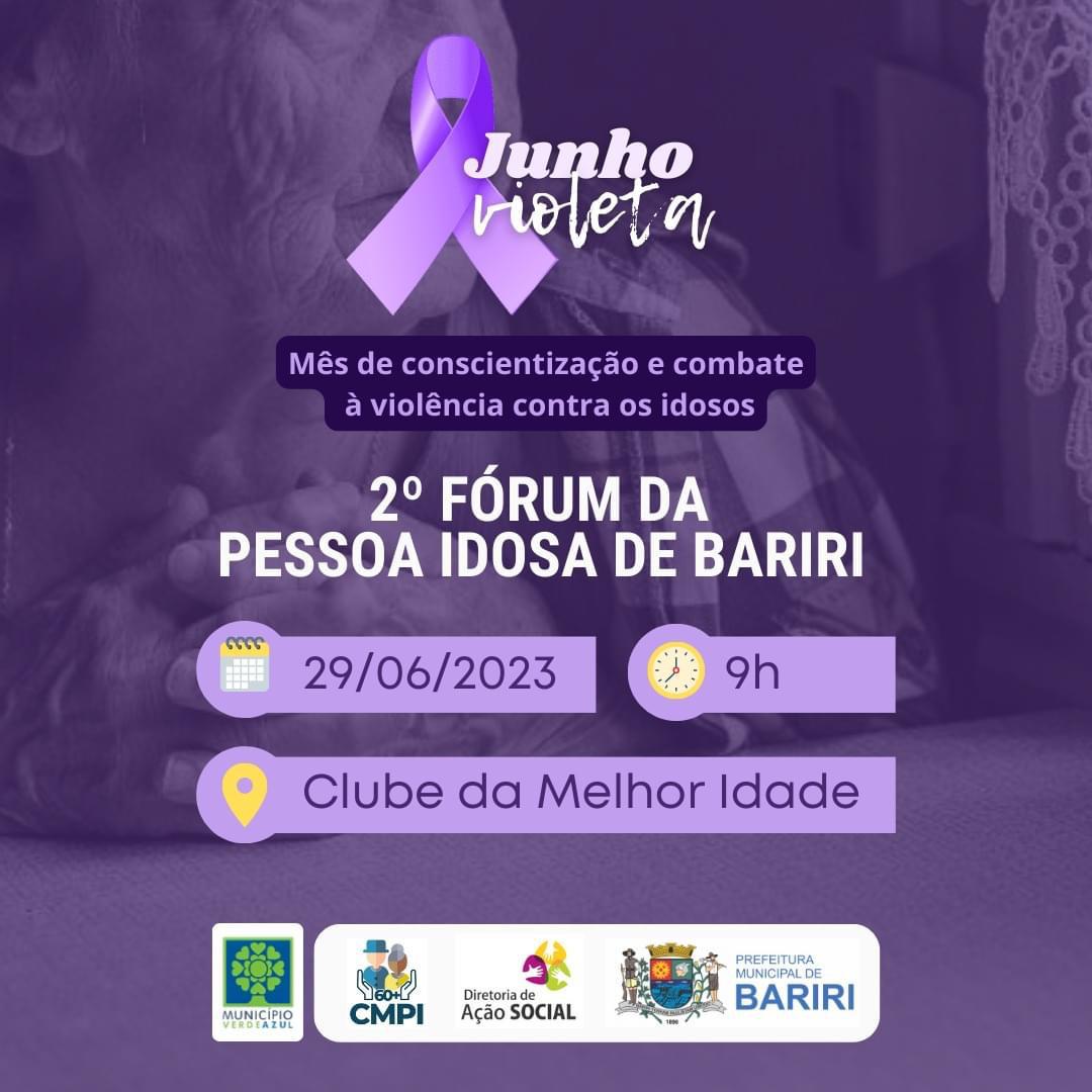 Quinta-feira (29), a partir das 9h, será realizado o 2º Fórum da Pessoa Idosa, no Clube da Melhor Idade. O evento é alusivo à Campanha Junho Violeta, que promove conscientização e combate à violência contra os idosos.
