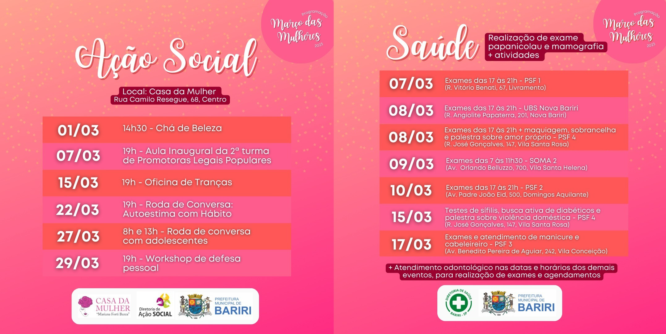Em comemoração ao mês da mulher, as Diretorias de Ação Social e de Saúde de Bariri prepararam programação especial no “Março das Mulheres 2023”. com uma série de eventos voltados a elas.