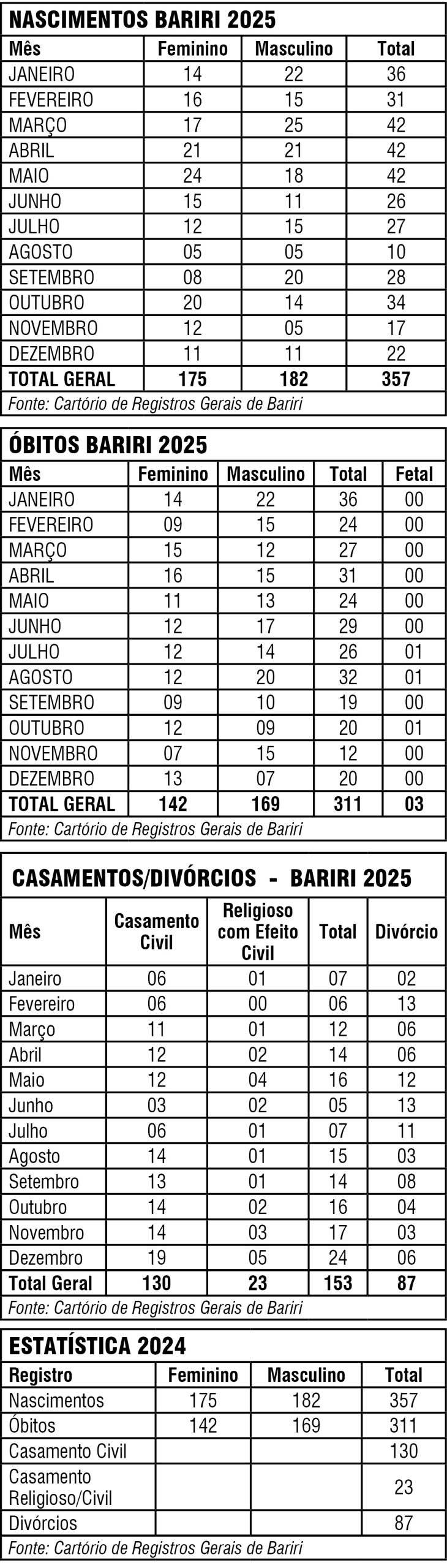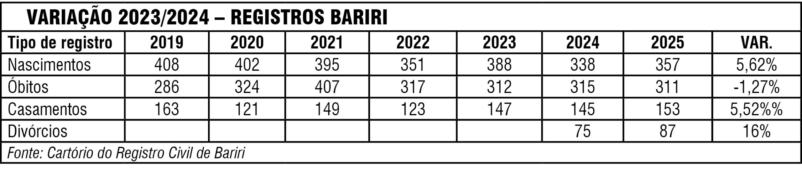 Em 2025, Bariri registrou alta no número de nascimentos, casamentos e divórcios, enquanto houve pequena queda no número de óbitos. Os dados foram obtidos junto ao Cartório de Registro Civil de Bariri e têm como base de comparação os índices de 2024.