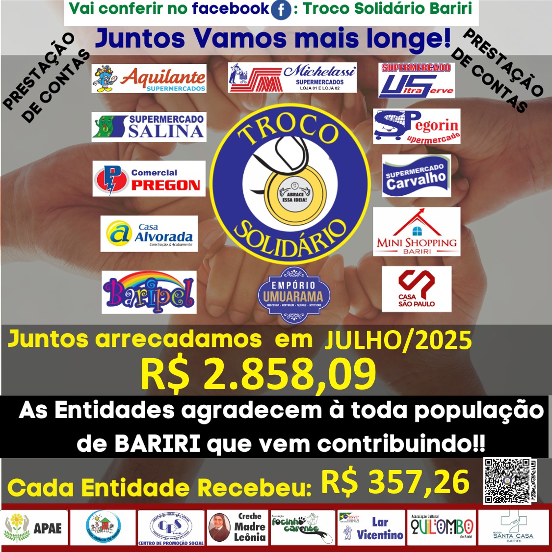 Bariri: Troco Solidário: julho rendeu R$ 357,26 para cada entidade