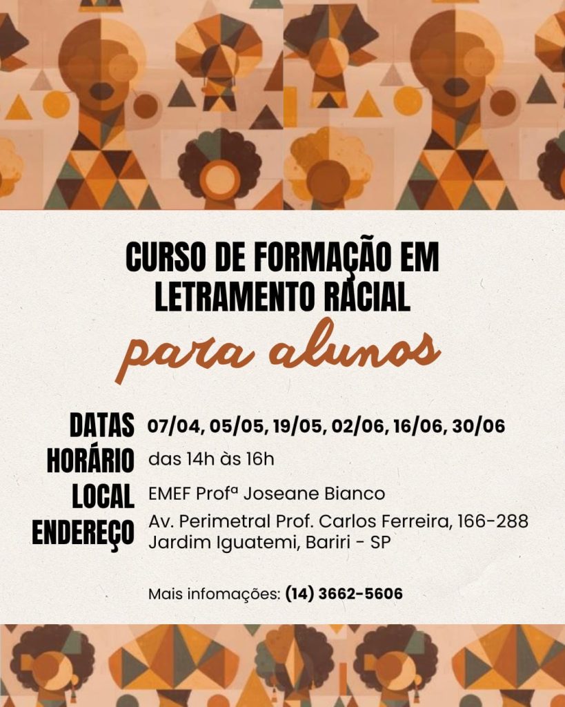 O curso de Letramento Racial será incorporado ao HTPC (Horário de Trabalho Pedagógico Coletivo) para todos os professores da rede educacional de Bariri.
