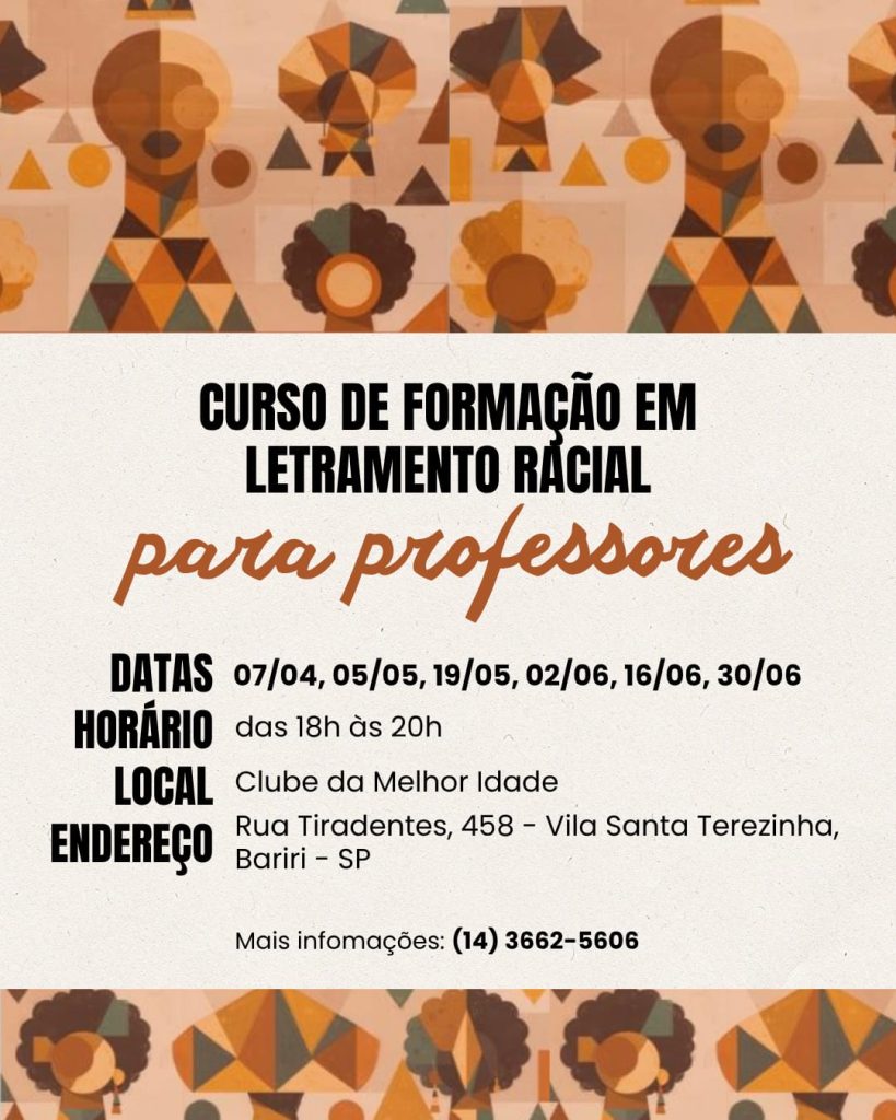 A Associação Cultural Quilombo de Bariri promove o 1º curso de Letramento Racial do município. O workshop será ministrado pelo corpo docente do núcleo FAAC (Faculdade de Arquitetura, Artes, Comunicação e Design) da Universidade Estadual Paulista “Júlio Mesquita Filho” (UNESP-Bauru).