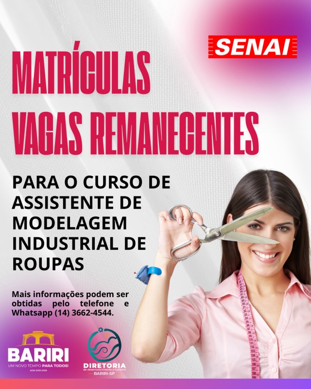 As matrículas para vagas remanescentes para o curso de Assistente de Modelagem Industrial de Roupas podem ser realizadas somente nesta segunda-feira (22). Serão preenchidas por ordem cronológica de matrícula.