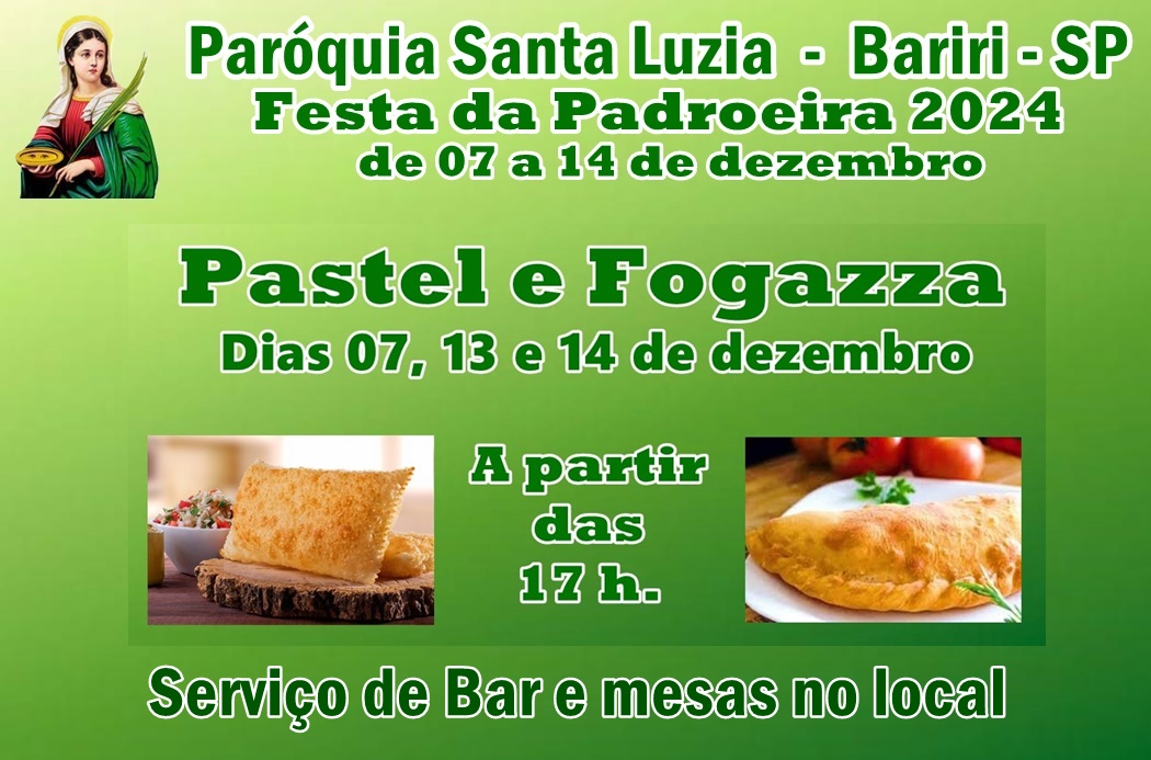 Nos dias 07 (sábado) e 13 e 14 (sexta e sábado) haverá venda de salgados – pastel e fogazza – a partir das 17h, além de barraca de doces.