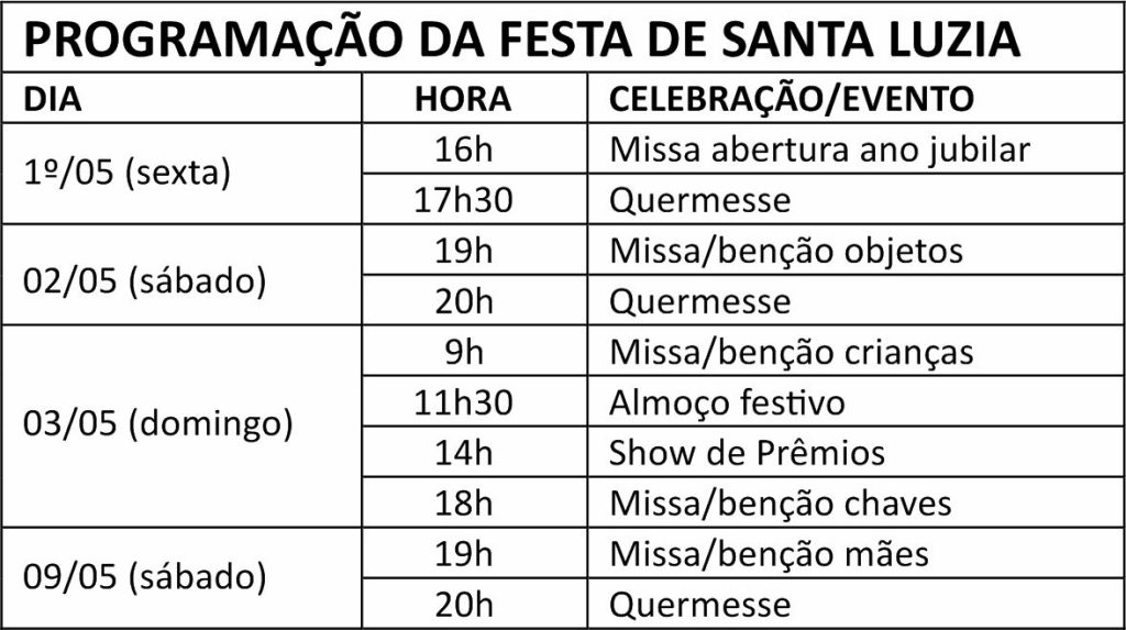 Coordenada pela pároco Carlos Menezes Jr., a programação religiosa prevê missas comemorativas, com bênçãos especiais e celebrações solenes, sempre na Igreja de Santa Luzia. A missa de abertura da programação (25/04) e do ano jubilar paroquial (26/04) foram celebradas no final de semana passado, com a participação de bom número de fiéis.