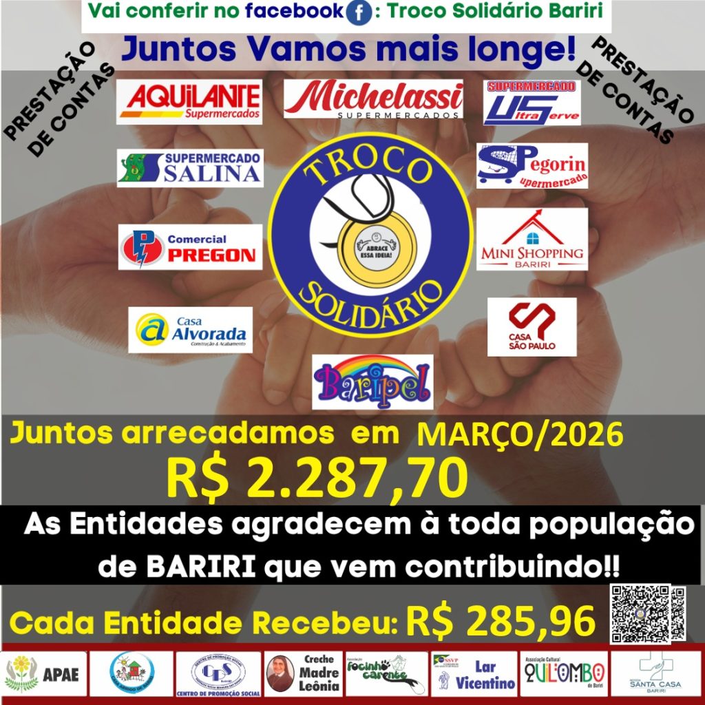 No mês de fevereiro de 2026, o Projeto Troco Solidário arrecadou R$ 2.287,70, valor que rendeu a cada entidade beneficiada R$ 285,96.