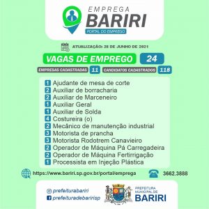 Para mais informações, acesse o “Emprega Bariri” no link https://www.bariri.sp.gov.br/portal/emprega.