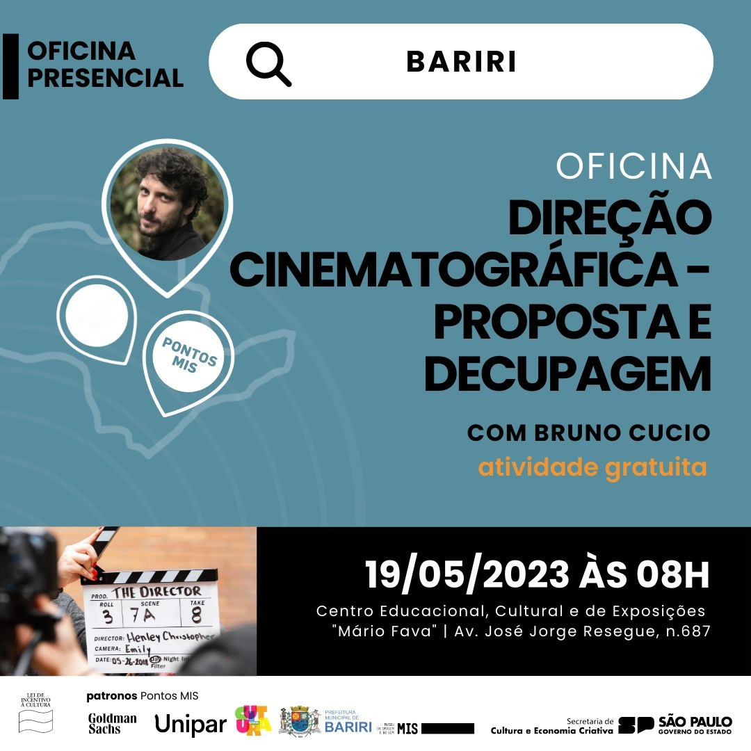 Sexta-feira (19), o Setor de Cultura da Prefeitura de Bariri traz oficina de Direção Cinematográfica – Proposta e Decupagem, a partir das 8h, no Centro Educacional, Cultural e de Exposição Mário Fava.