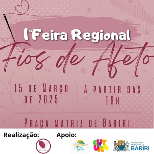 Sábado (15), a partir das 19h, na Praça da Matriz, Bariri vai sediar a 1ª Feira Regional Fios de Afeto, com a presença de artesãos de toda a região.