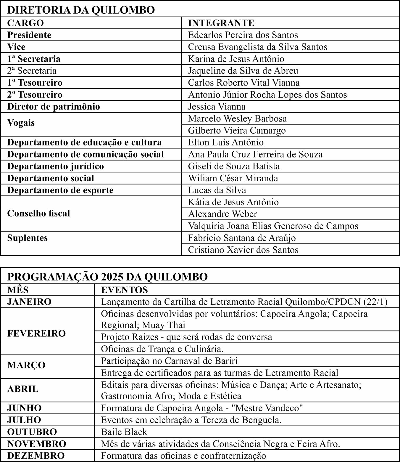 A Associação Cultural Quilombo de Bariri está sob nova direção. O ex-vereador e pastor Edcarlos Pereira dos Santos assumiu a presidência da organização da sociedade civil (OSC). A professora Creusa Evangelista da Silva Santos, a Cleo Santos, é a vice-presidente.