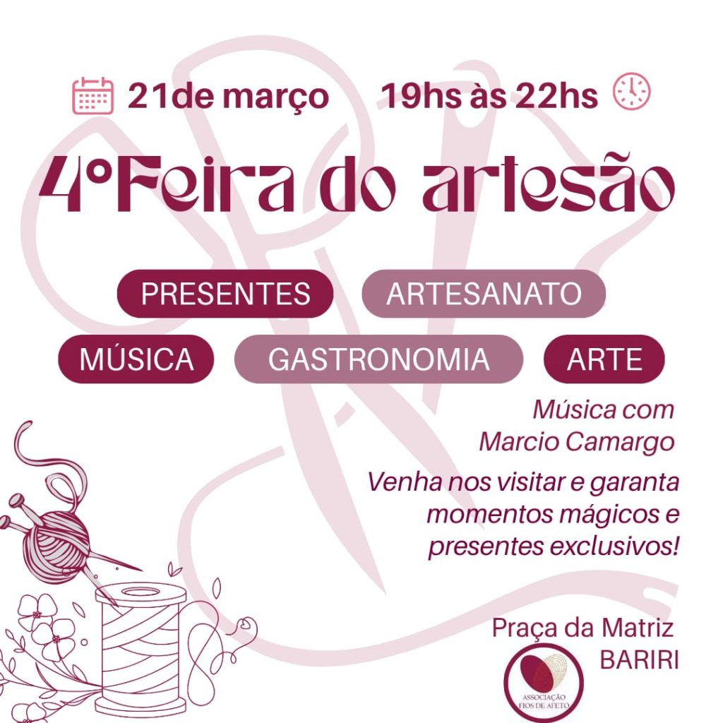 Durante o mês de março, a Associação Fios de Afeto de Bariri vai ministrar várias oficinas de artesanato, que vão culminar na 4ª Feira do Artesão, prevista para dia 21, sábado.