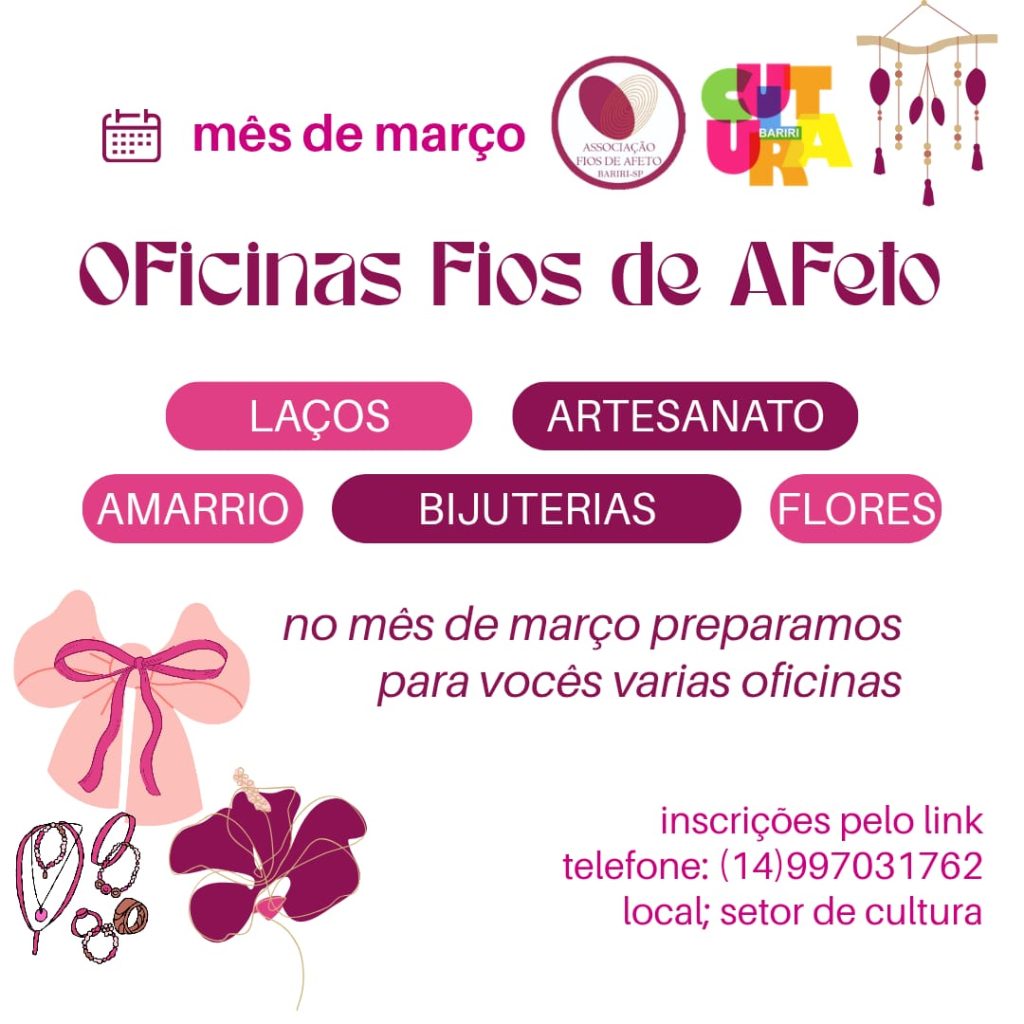 As oficinas oferecidas são de laços, artesanato, amarrio, bijuterias e flores. São gratuitas e com vagas limitadas. As inscrições podem ser realizadas através do link: https://docs.google.com/forms/d/e/1FAIpQLSfvgun1u9E0V0Fn-oqm3kyu3jzo2kWhFVvNdiUjjgsPYAzxbg/viewform.