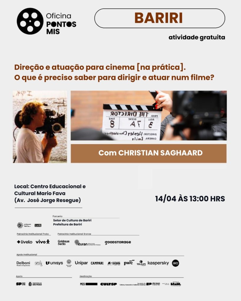 A oficina será ministrada cineasta, educador e programador audiovisual, Christian Saghard, que vai explorar na prática os caminhos da direção e atuação para o cinema.