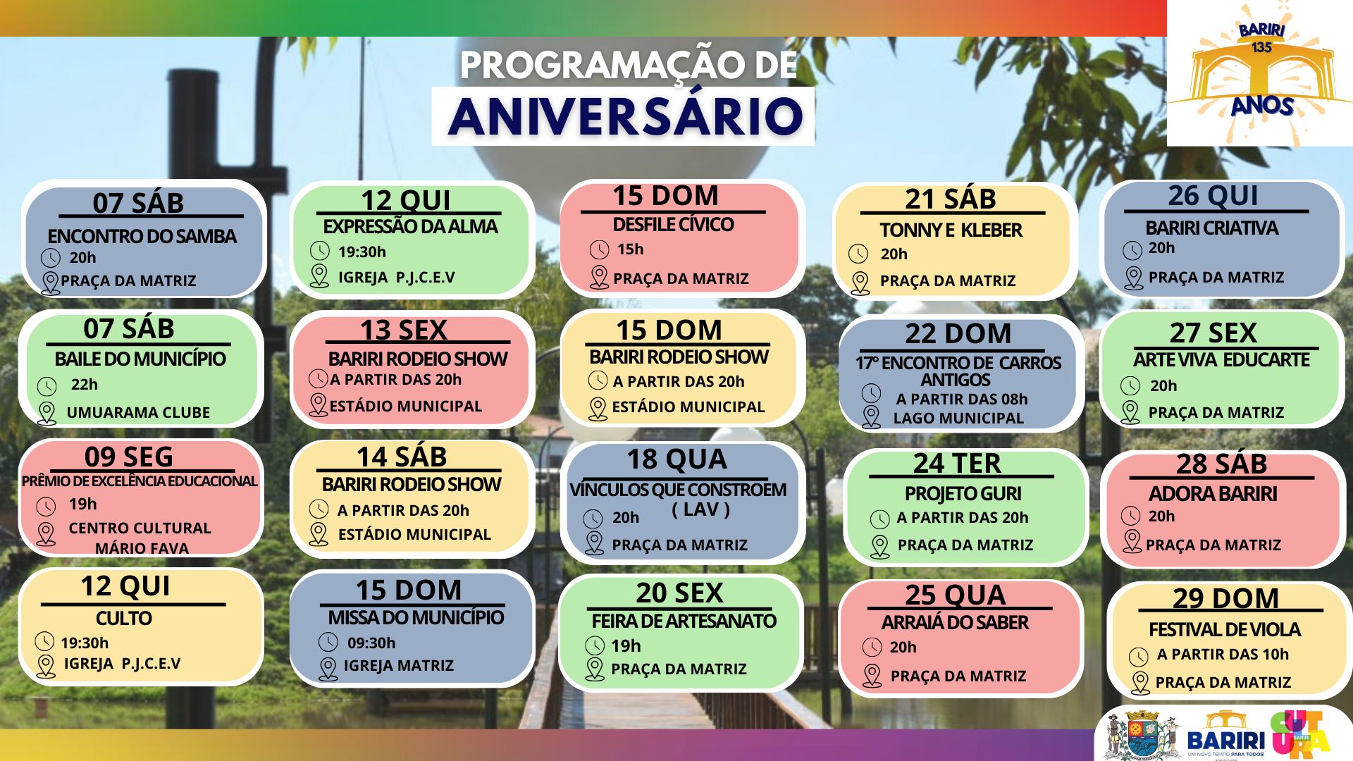 A Diretoria de Educação e Cultura da Prefeitura de Bariri divulgou programação oficial em comemoração aos 135 anos de emancipação político-administrativa de Bariri