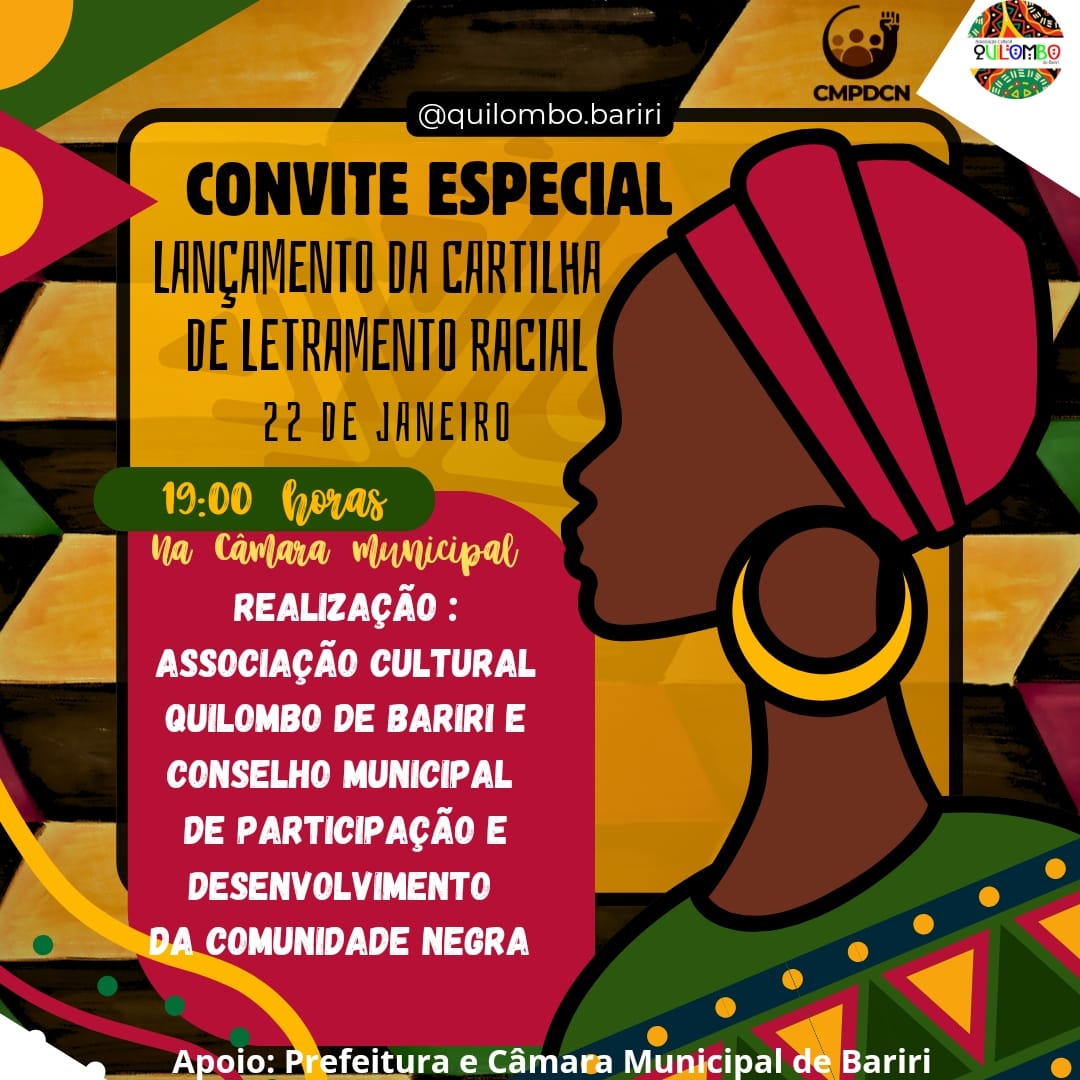 Dia 22 de janeiro, quarta-feira, a Associação Cultural Quilombo de Bariri realiza solenidade de lançamento de Cartilha de Letramento Racial.