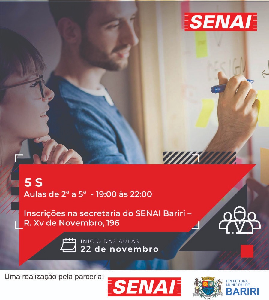 Escola Municipal de Formação Profissional Francisco Leone, ligada ao Senai, está com inscrições abertas para o curso de aperfeiçoamento profissional – 5S. A ferramenta busca a melhoria da produtividade e satisfação dos clientes, seguindo procedimentos de trabalho e normas de qualidade, saúde, segurança e meio ambiente.