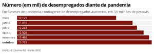 O desemprego diante da pandemia do coronavírus bateu novo recorde em outubro, apontam os dados divulgados nesta terça-feira (1º) pelo Instituto Brasileiro de Geografia e Estatística (IBGE).