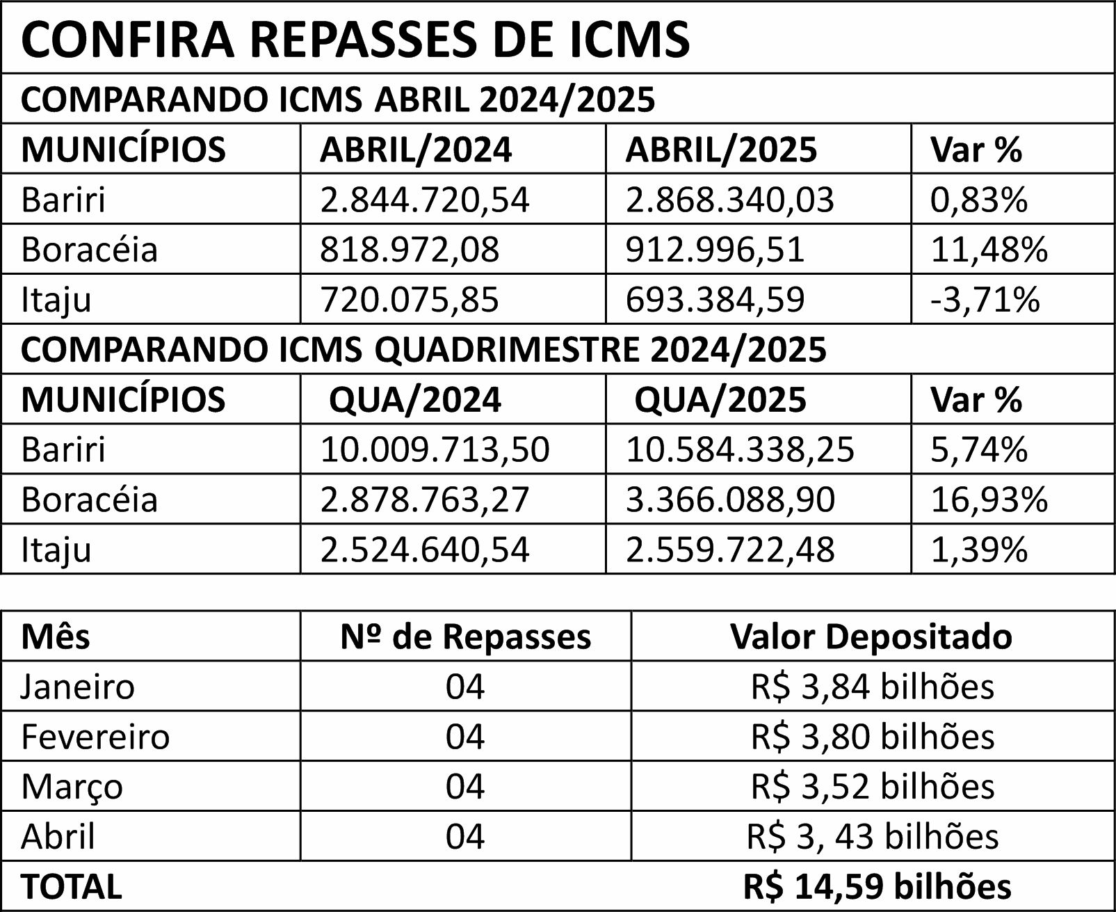 No mês de abril, o melhor desempenho entre os três municípios foi o de Boraceia, que recebeu R$ 912.996,51 de ICMS, o que representa alta de 11,48% em relação ao repasse de 2024, quando foram transferidos R$ 818.972,08.