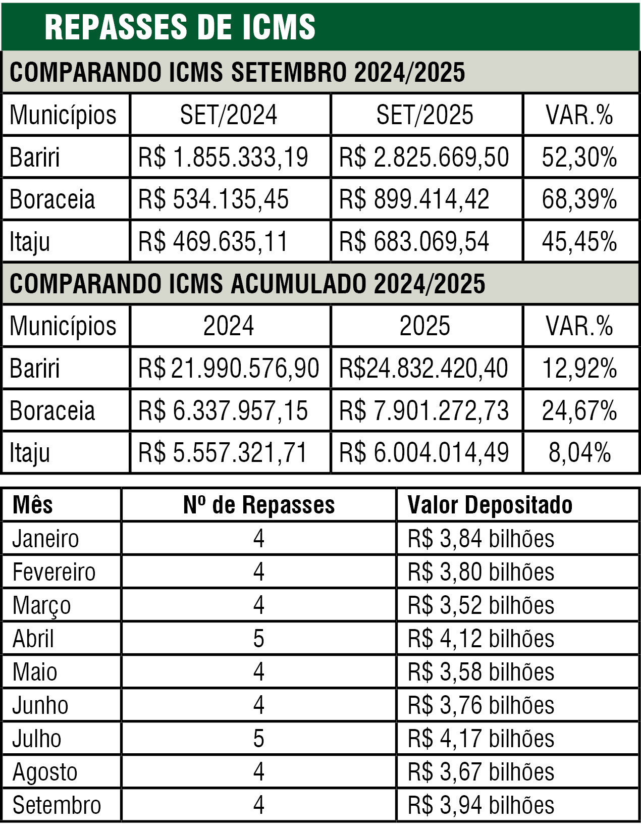 No acumulado do ano de 2025, Bariri obteve alta de repasse de ICMS de 12,92%; Boraceia de 24,67%; e Itaju, de 8%; se comparado com o mesmo período em 2024.