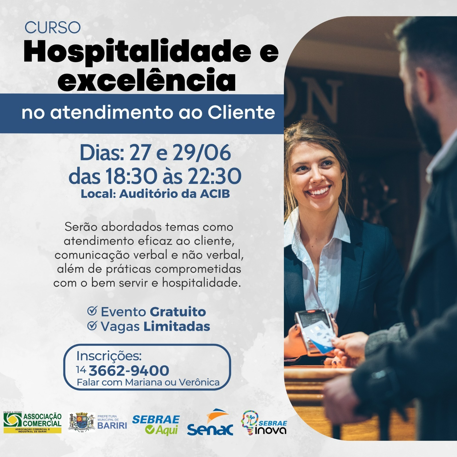 Dias 27 e 29 de junho, será disponibilizado para Bariri curso de Hospitalidade e Excelência – no Atendimento ao Cliente, como resultado de parceria entre a Associação Comercial e Industrial de Bariri (Acib), Prefeitura de Bariri, Senac e o Sebrae.