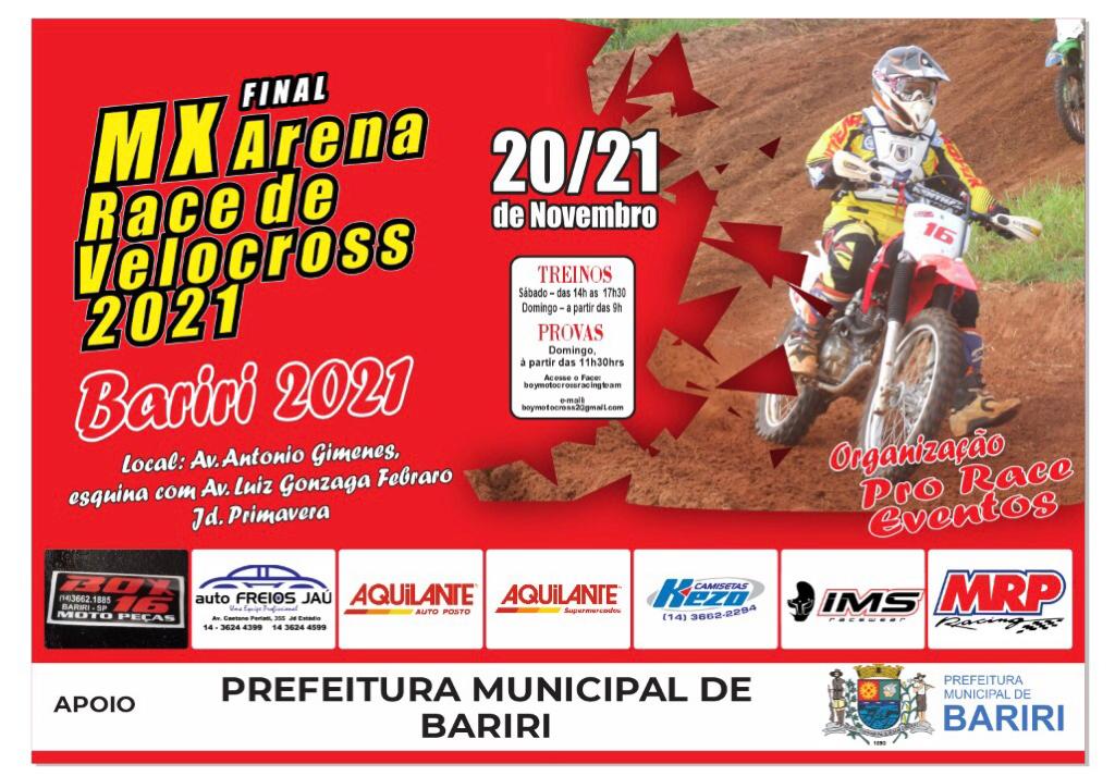 O Município de Bariri sediará a final do campeonato MX Arena Race de Velocross 2021 nos dias 20 e 21 de novembro. O evento está sendo organizado pela Pro Race Eventos e conta com o apoio da Prefeitura Municipal de Bariri.