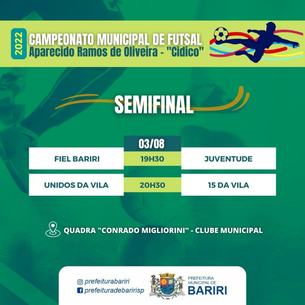 Serão realizados nesta quarta-feira (3) os dois jogos da semifinal do Campeonato Municipal de Futsal de Bariri – 2022 “Aparecido Ramos – ‘Cidico’’.