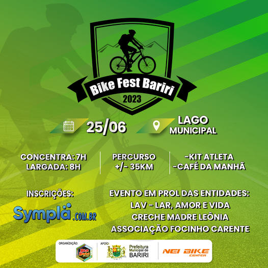 A 3ª edição do Bike Fest MTB e Running Fest Bariri será no dia 25 de junho, domingo, com concentração, largada e premiação no Lago Municipal Prefeito Accácio Masson.