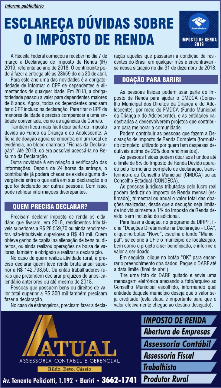 No caso de quem realiza atividade rural, é preciso declarar quem teve renda bruta anual superior a R$ 142.798,50. Ou então trabalhadores rurais que pretendem declarar prejuízos de anos-calendário anteriores ou até mesmo de 2018.