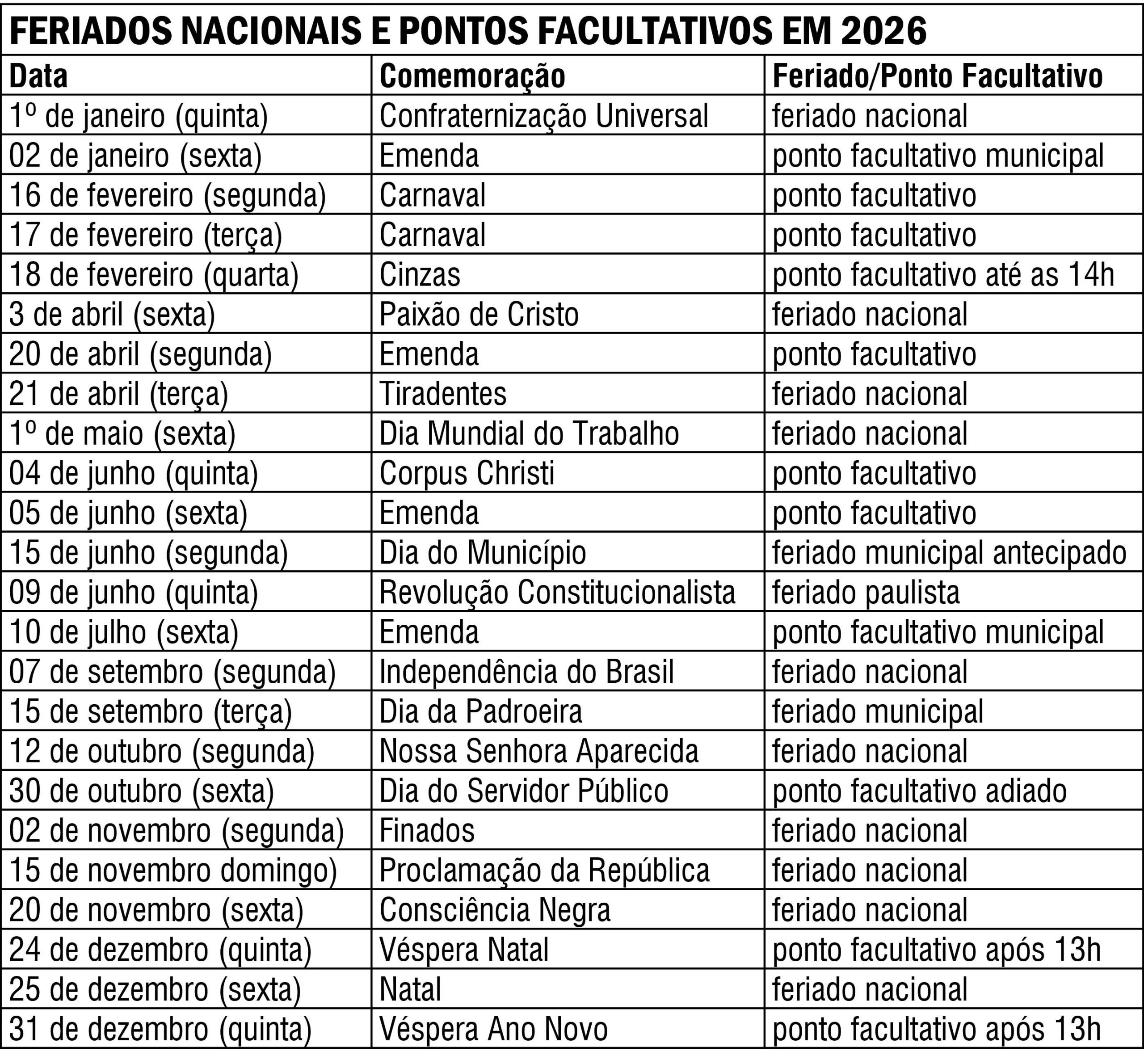 É o caso do feriado paulista da Revolução Constitucionalista (9 de julho), que em 2026 cai em uma quinta-feira. Governo estadual e de Bariri já decretaram ponto facultativo no dia 10 de julho, sexta-feira, aumentando os feriadões.
