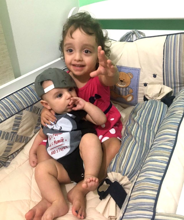 A pequena Helena com o irmão Noah de oito meses: menina apresenta dificuldades para andar e deficiência na coordenação motora — Foto: Arquivo pessoal