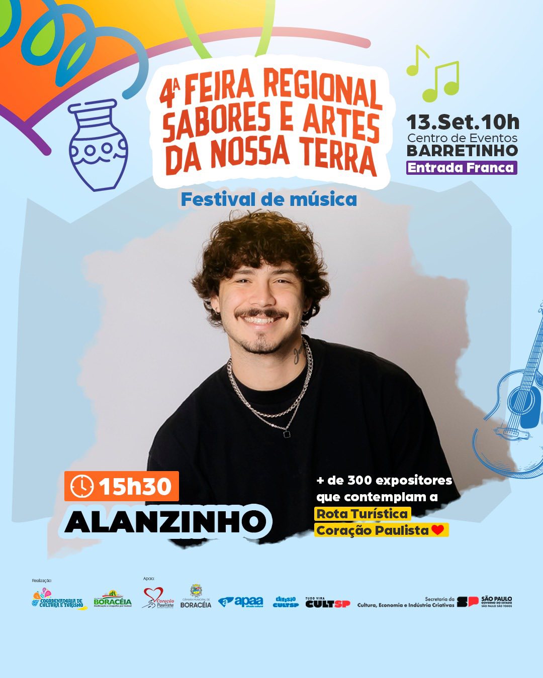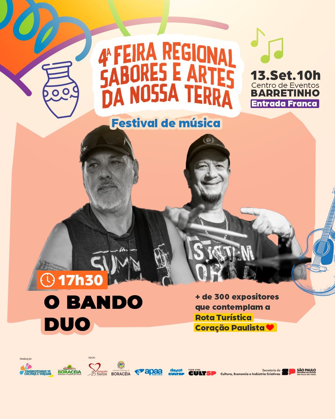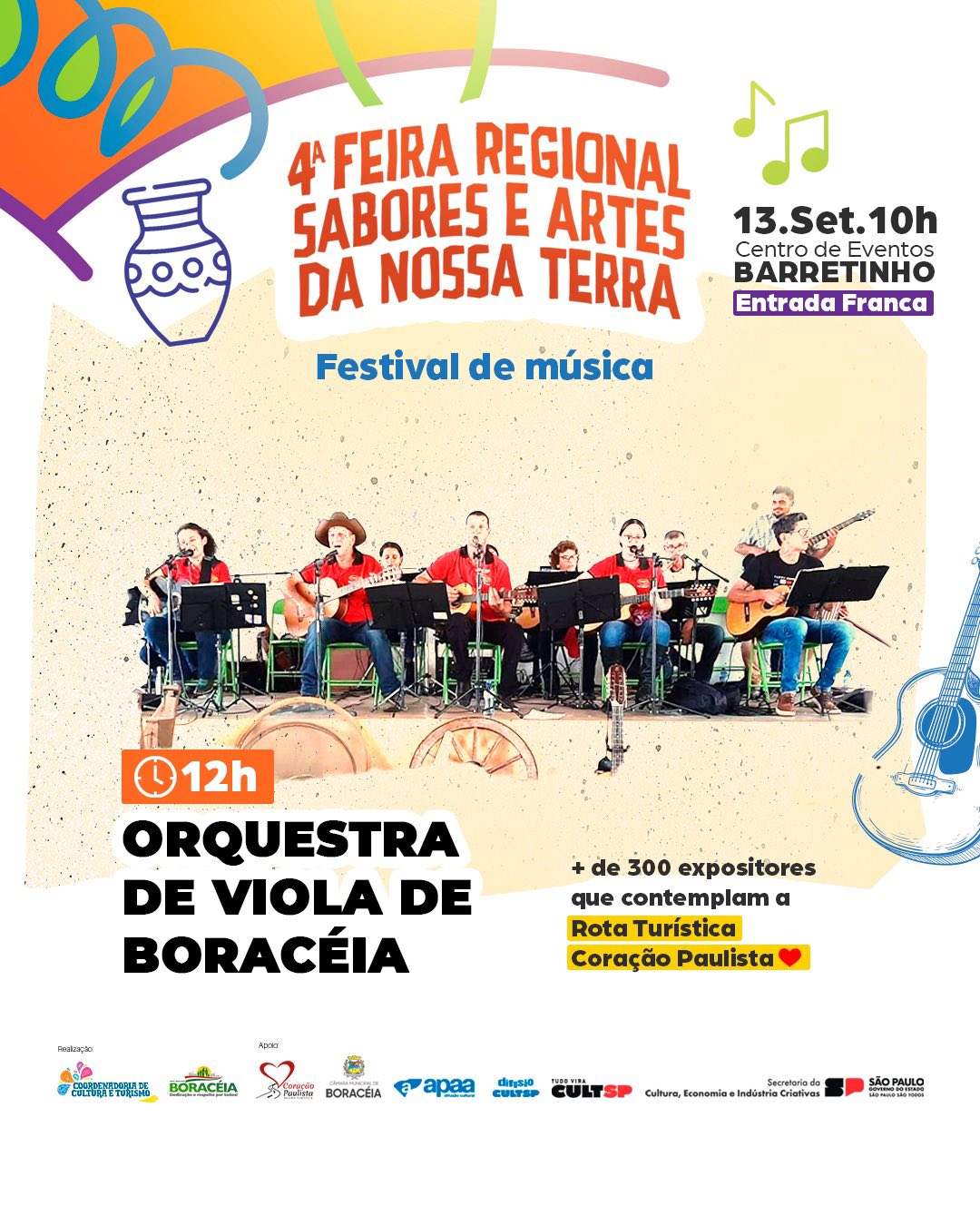 A 4ª edição da Feira Regional Sabores e Artes da Nossa Terra é uma realização da Prefeitura de Boraceia, através da Coordenadoria de Cultura e Turismo, com apoio da Rota Turística Coração Paulista e da Câmara Municipal de Boracéia.