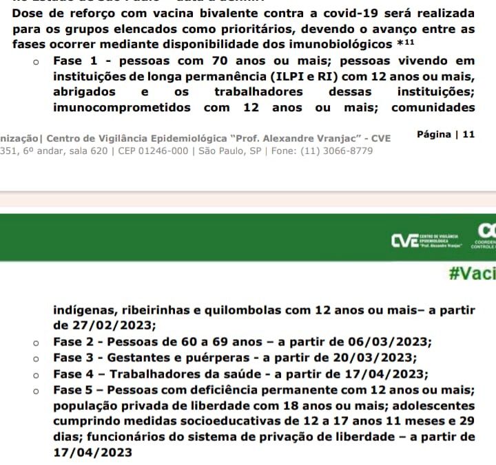 Vale ressalta que continua liberada a vacinação da bivalente para os grupos de etapas anteriores: pessoas de 70 anos e mais; pessoas vivendo em instituição de longa permanência a partir de 12 anos e seus trabalhadores; pessoas imunocomprometidas a partir de 12 anos de idade; população indígena, quilombolas e ribeirinhos a partir de 12 anos; pessoas de 60 a 69 anos de idade (2ª etapa); gestantes e puérperas; e trabalhadores da saúde.