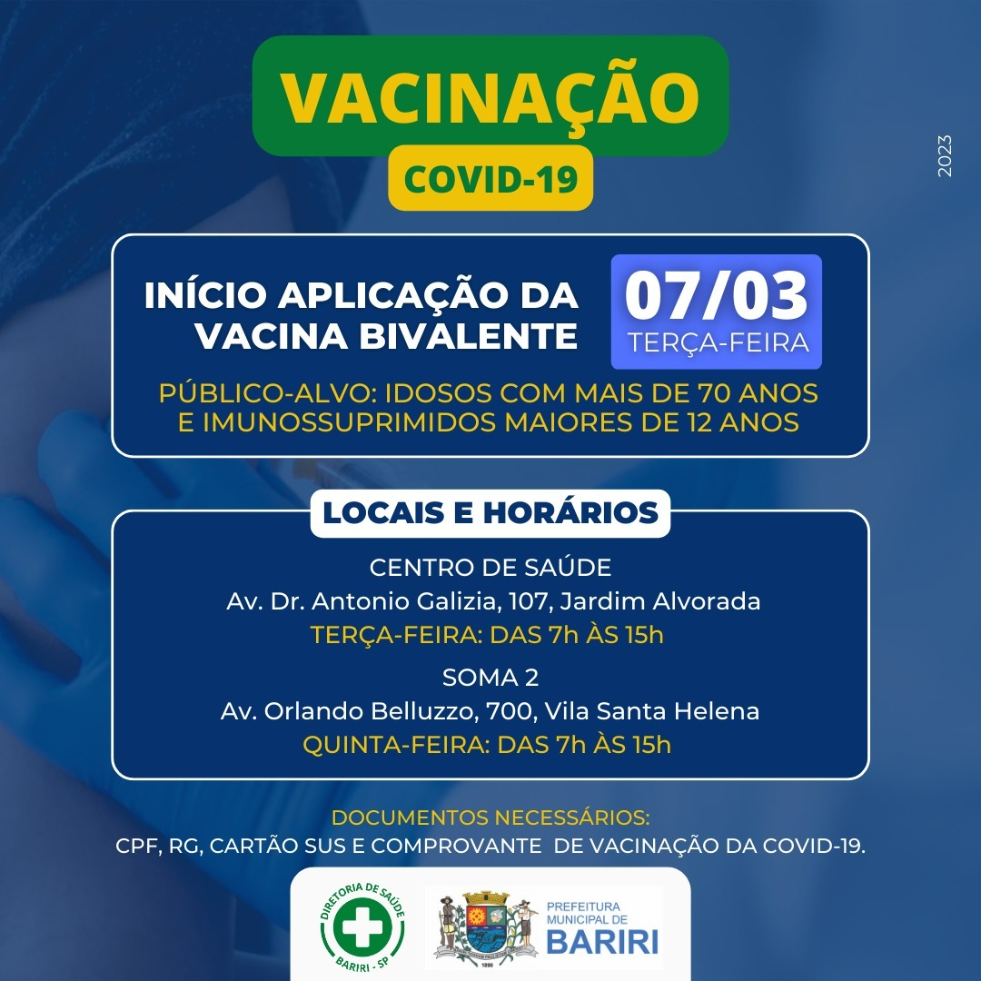 A Diretoria de Saúde de Bariri iniciará na terça-feira (7) a aplicação da vacina bivalente contra a Covid-19 para idosos com mais de 70 anos e imunossuprimidos maiores de 12 anos.