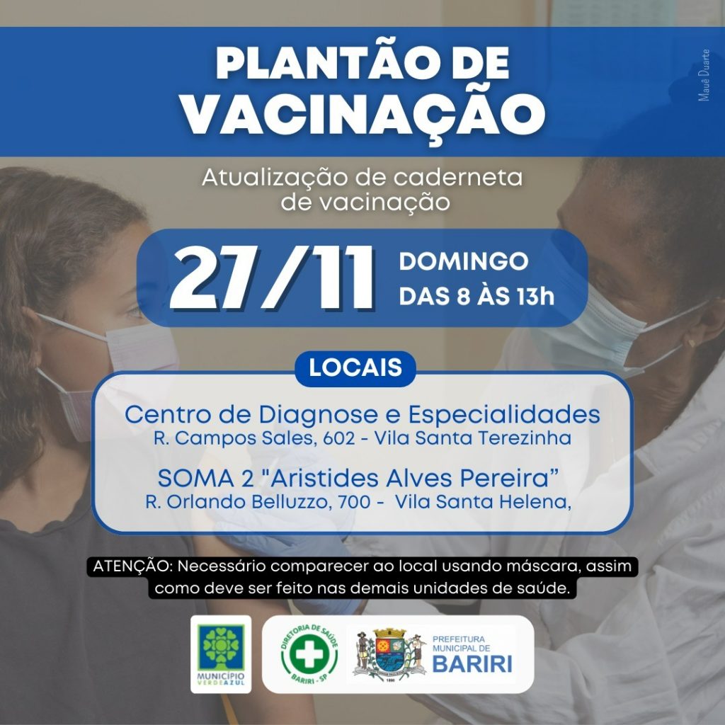 Dia 27, domingo, a Diretoria de Saúde da Prefeitura de Bariri promove plantão para atualização de caderneta de vacinação. A ação ocorre em dois postos: Centro de Diagnose e Especialidade Dr. José Dorly Borges (centro) e Soma 2 Aristides Alves Pereira (Caixa D’Água), das 8 às 13 horas.