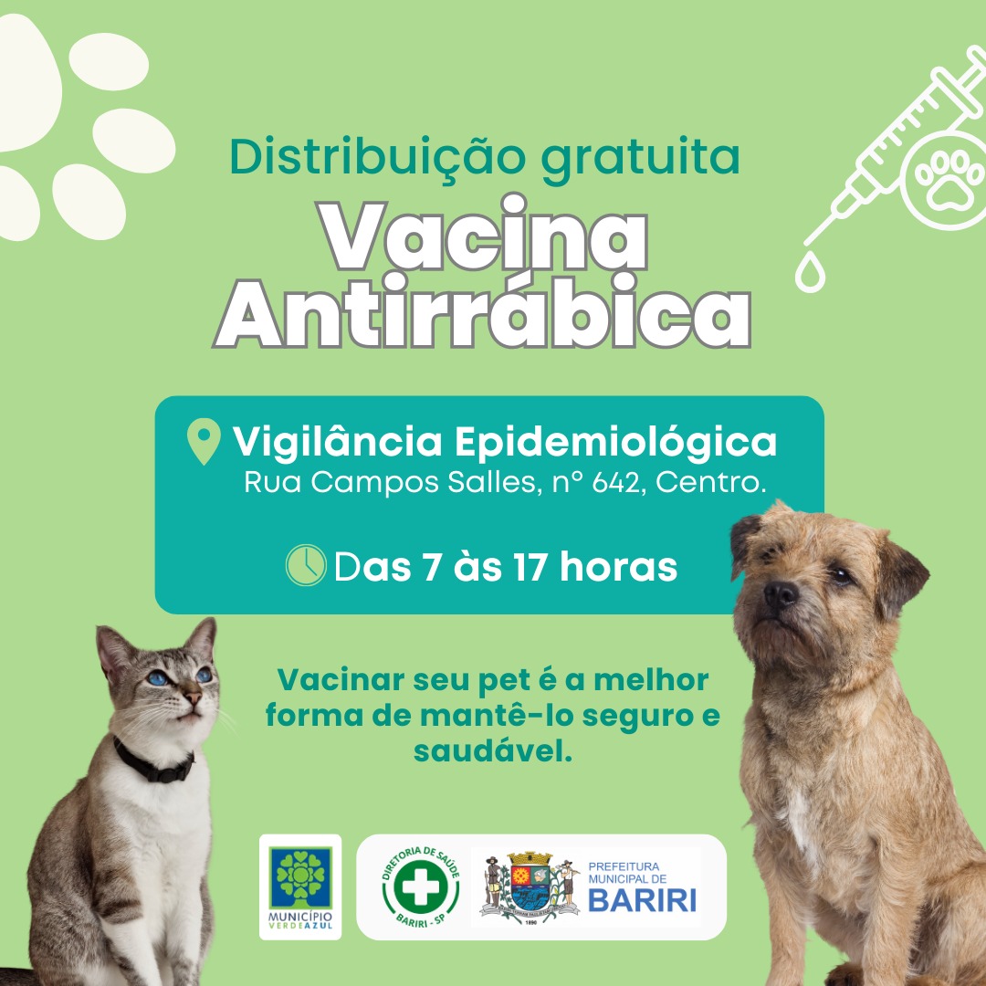 Através da Vigilância Epidemiológica (VE), a Diretoria de Saúde de Bariri disponibiliza vacinas antirrábicas de graça à população. As famílias interessadas devem comparecer à sede da VE para retirada.